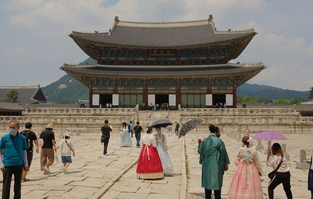 韓服を着て撮影を楽しむ旅行者の姿も多く、建物との組み合わせがフォトジェニックな光景を生み出しています。