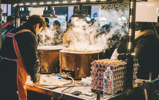 屋台ではホットク(甘い揚げパン)やトッポッキ、韓国式おでんといった人気のローカルグルメを気軽に楽しむことができます。